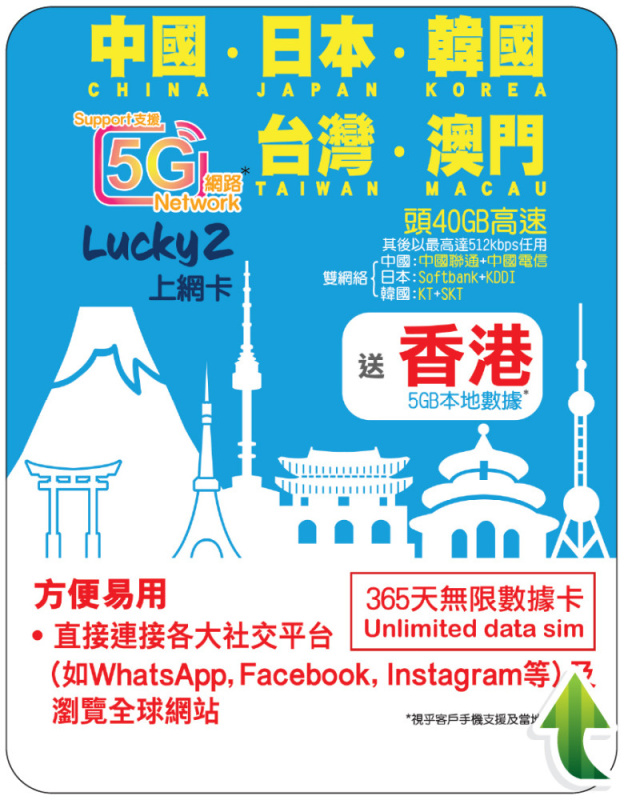 - 中國澳門台灣日本韓國(前 40GB 200Mbps 其後512Kbps無限)
