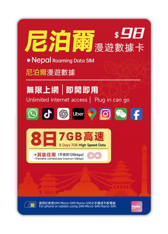 準備好出發去尼泊爾(Nepal)行山朝聖、遊覽加德滿都?去過嘅人都知,喺尼泊爾當地搞一張電話卡極度麻煩,要填長表、交相片仲要複印護照!不想浪費寶貴嘅旅遊時間?【Hello SIM 尼泊爾 8日 7GB 高速漫遊數據卡】 絕對係你嘅最佳旅伴!呢張卡標榜 「真正免實名登記」,喺香港買定帶過去,落機一插卡就自動激活。8 日內提供 7GB 高速數據,無論係上網睇 Google Maps、定係喺雪山前影相 Post IG 打卡都暢通無阻。實價只需 HK$98,用完高速仲有低速無限保底,俾你安心享受尼泊爾之旅!